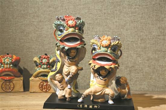 “很喜欢黄飞鸿这个人物,于是,就把他和醒狮结合起来,用陶泥塑造出来。我从1998年就开始创作这个题材了,直到目前做了很多款文创产品。”对于黄飞鸿舞狮题材的作品,周永锵倾注了大量心血,他通过反复观看黄飞鸿题材电影研究人物形象、动作、神态,并通过参观民间艺人的狮头扎作技艺研究醒狮造型。目前,周永锵的黄飞鸿舞狮文创产品,已是石湾著名的旅游手信。