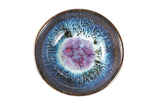 仿若绚烂烟霞、奇幻星空坠落杯中,美妙绝伦……历经约一年的实验,功夫不负有心人,岳青俊独具石湾特色的柴烧广钧窑变釉茶杯终于烧制成功。自此,他相继烧制出色彩多变的蓝色花纹蓝钧釉、红中透紫的钧红紫釉,以及石湾红釉石榴红。