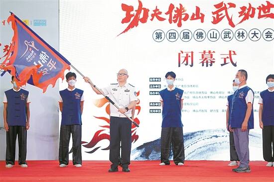 羊城晚报讯 记者张闻、通讯员陈敏杰摄影报道:8月27日晚,在“功夫佛山,武动世界”第四届佛山武林大会暨2022佛山功夫文化交流大会闭幕式上,佛山市公安局党委委员、副局长梁恩球向新一届佛山武术协会理事会授予“佛山功夫平安志愿队”队旗,推动佛山功夫平安建设迈向新的台阶。