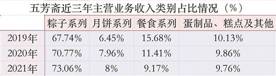 但实际情况是,近三年来,五芳斋粽子单项业务的营收贡献率均在七成左右,且这一趋势还有逐渐加重的迹象。2019年至2021年,五芳斋粽子系列产品收入分别为16.09亿元、16.44亿元和20.08亿元,占主营业务收入的比例分别为67.74%、70.77%和73.06%。其他业务,如月饼系列,餐食系列,蛋制品、糕点及其他收入在2021年度所占主营业务收入的比例分别为8%、9.17%和9.76%。