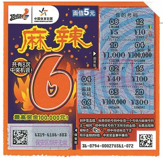 8月26日20时左右,购彩者刘女士(化名)急急忙忙来到广东省韶关市翁源县龙仙镇建设一路4406030037实体店,小心翼翼地拿出一张顶呱刮“麻辣6”,招呼代销者帮忙看看彩票。原来,这位购彩者购买了几张“麻辣6”,刮开其中一张时竟然中出“¥100,000”,她便立即跑到体彩店确认。