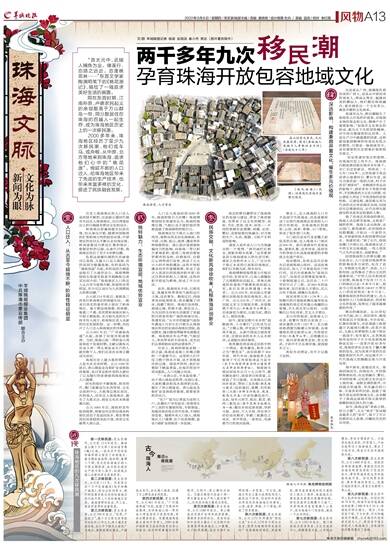 纵观这波澜壮阔的历史画卷可以发现,大量人口迁入珠海,有的是因为躲避战祸,有的是因为“通海夷道”兴起,有的是因为制盐业吸引了大量劳动力。珠海博物馆馆长张建军接受羊城晚报记者采访时介绍:“珠海地区人口的迁入从古至今延绵不断,阶段性非常明显,至少可以划分为九次规模较大的移民潮。”
