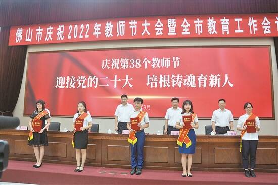 羊城晚报讯 记者谭洁文、梁正杰报道:在全国第38个教师节来临之际,9月8日上午,佛山市庆祝2022年教师节大会暨全市教育工作会议召开。今年佛山市政府认定了佛山市教育系统310名优秀教师、200名优秀班主任、105名先进教育工作者。会上,优秀教师、优秀班主任、先进教育工作者的代表获颁证书。