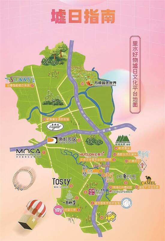 为此,里水镇设计推出了一张展示里水好物的墟日“寻宝地图”,覆盖里水镇的行政区划。广佛江珠高速和广佛肇高速一纵一横贯穿其中,搭配交叉分布的道路网络和南北两条水道,组成这张寻宝地图的骨骼和经脉。周可介绍,“地图”的准入门槛有三大原则:一是首先是“好物”,进驻平台的企业和产品比较成熟、管理规范、口碑良好、有一定特色,在行业内比较有代表性,是“四上”企业;二是要有较好的市场需求空间,所选产品要与生活息息相关,是能够直接卖给消费者的终端产品,因此第一批优先选择的20家企业,产品主要涵盖食品药品、生活家居、装饰服装、住宿旅游等;三是企业自愿原则,进驻平台的产品都是企业自愿组织,主动让利回馈本土消费者。