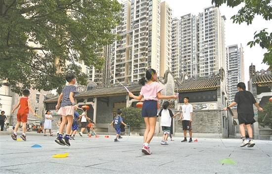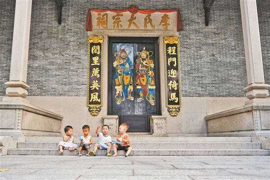老人和小孩在祠堂附近闲聊、玩耍,充满闲适的生活气息