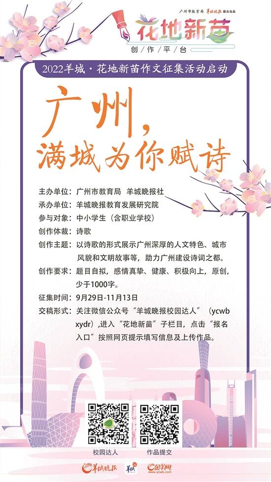 为增添广州的诗歌文学色彩,在广大中小学学生以及广州文学圈子中强化广州诗歌的独特定位,助力广州建设诗词之都,广州市教育局联合羊城晚报社举办2022年羊城·花地新苗作文征集活动。活动已于9月29日启动,诚邀广大中小学生结合生活实际,从校园生活、家庭生活、文化生活等方面入手,通过诗歌的形式进行文学创作,展现广州深厚的人文特色、城市风貌和文明故事。