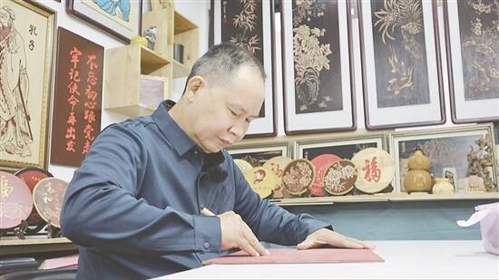 宝安区木刻画非遗传承人陈永兴正坐在桌前雕刻