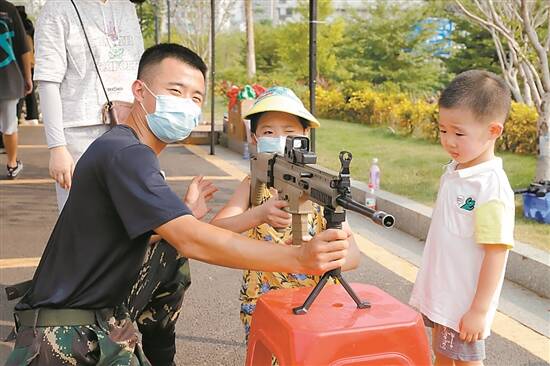 今年8月,广受好评的“铭记历史功勋·担当时代使命”国防教育“六进”巡展活动在国防主题教育公园开展。著名军事史专家徐焰专门遴选出近300幅体现中国人民解放军不同历史时期的高像素油画图片讲述中国人民解放军95年来的发展历程。现场还准备了“建军95周年图片展答题卡片”,居民们带着问题从图片展中寻找线索,发现答案,并参加射击等军事体验活动,在寓教于乐中学习国防知识。