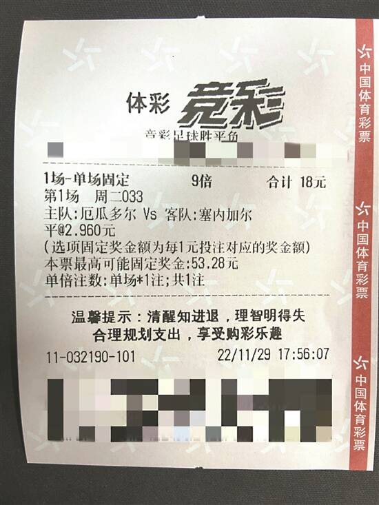 分享有风险,晒票要谨慎。一张体育彩票,详细记录了投注时间以及投注内容。彩票下方的二维码区域,保存了这张彩票的序列码、密码以及电子签名信息。通过电子签名,可以校验这张彩票的投注信息。