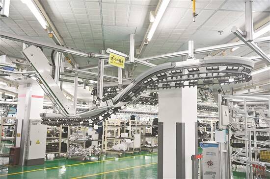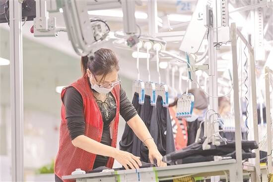 生产车间内,一条智能吊挂系统的轨道蜿蜒在整个车间,且串联于车间多楼层,该系统的运行,实现了成衣从面料到裁剪,再到缝纫、整烫、包装一轨完成。