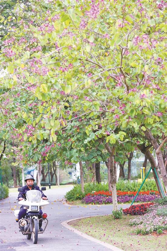 东莞植物园春意盎然,保安在花间巡逻