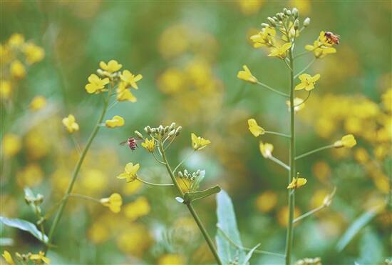 蜜蜂在层层叠叠的油菜花间飞舞