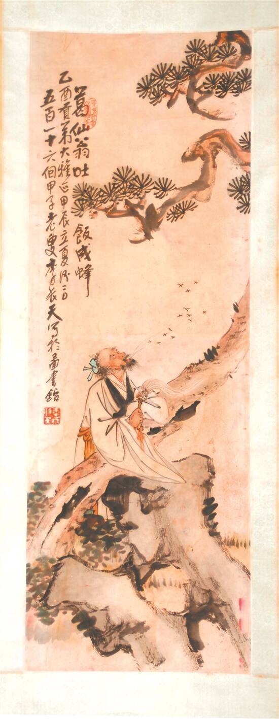 两年后,年届花甲的李长天正式入西湖元妙观为道士。他避世但并没有忘世,更没有放弃手中的画笔。在元妙观,他半天绘画,半天到学校上课,故自号“半日道人”。虽说是“半日道人”,其实并未能“不为物累”远离尘俗。面对着干戈扰攘、民生凋敝的社会现实,他常借杯中物消愁解忧,在酣醉之中挥毫写画:“秋来木叶多摇落,日暮寒鸦不肯栖。道人醉酒淋滴墨,半是巫山半是云。”
