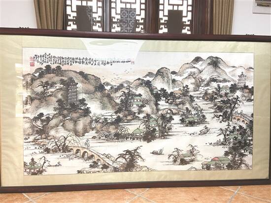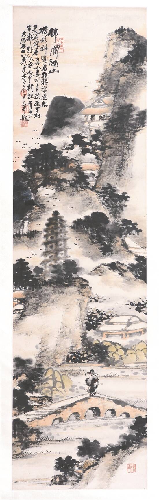 在此期间,李长天画了直幅《锦绣湖山图》。他经常自我调侃说:“糊涂糊涂又糊涂,涂来涂去画西湖。”现在其流传下来的《惠州西湖图》中,有六尺、五尺、四尺横幅及大小斗方等,多是精心绘写的力作,构图笔法墨法都有所变化,无论平远、高远、深远,浑厚完整,既有宋人画的大气,又有鲜明的地域特色,在惠州乃至省港两地影响颇大,被称为“西湖画家”。