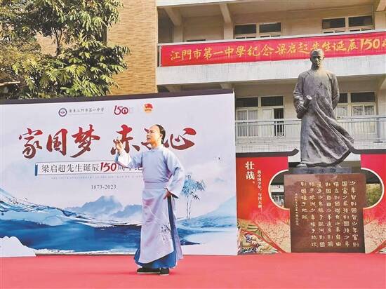 江门一中则举行了以“家国梦 赤子心”为主题的梁启超先生诞辰150周年纪念活动。江门市粤剧传习所副所长、艺术总监陈艺文则在活动中表演粤剧《梁启超·少年中国》。