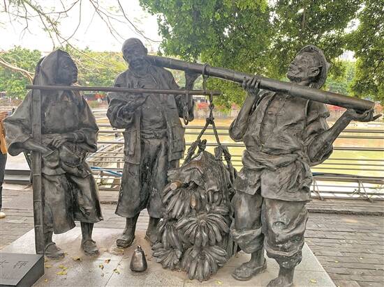 直到1970年代,市民从江门前往广州,大都要来长堤乘坐“花尾渡”。林先生说,他听父亲提过,“花尾渡”停靠在如今长堤青年广场外的5号码头上。钓台故址旁有个船员俱乐部,当时客人买船票、商人办货运,都是在船员俱乐部里找航运公司办理。船员们白天在船员俱乐部里休息,晚上6时到8时开船出发。坐船的、送船的都在码头附近的长堤沿岸等着。当时长堤卖粥、炒河粉、炒蚬、炒螺等摊档沿岸遍布,市民可坐在摊档摆设的长凳上一边吃着热气腾腾的蚬粥、一边等船。“上船后在船上睡一晚,第二天白天就到了广州。”