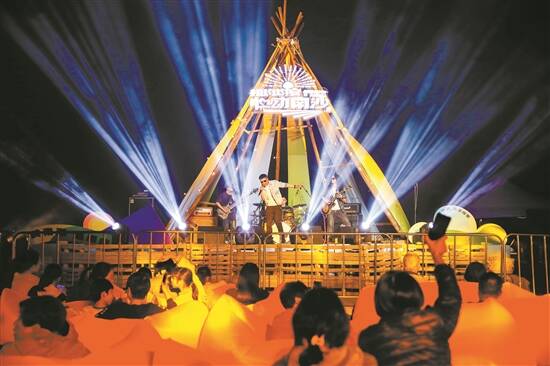 此次音乐节,主办方还在草地设置了帐篷区和充气沙发区,市民朋友三三两两地坐在软软的沙发里,拿起手机打开闪光灯,一起为台上卖力演出的乐队歌手营造“荧光棒”氛围,不约而同地随着节拍晃动。