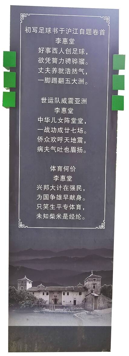值得一提的是,“世界球王”李惠堂除了一身球技出神入化外,还是一位善于写诗词的“绿茵诗人”。他在《初写足球书于沪江自题卷首》中写道:“好事西人创足球,欲凭膂力骋骅骝。丈夫养就浩然气,一脚踢翻五大洲。”这首诗写出了一代球王的豪情壮志,浩然恢弘。此外,李惠堂的诗歌,还有对家乡故土深切情怀的抒发。1941年抗战期间,他回到家乡五华有感,写了一首《久别故里,辗转回归,烽火漫天,感吟寄意》:“耿耿幽怀问所哀,孑身何事故乡来?山河满地兵戈急,欲济时艰弭劫灰。”