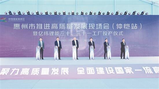 3月17日,惠州市推进高质量发展现场会(仲恺站)暨亿纬锂能三十、三十一工厂投产仪式在中韩(惠州)产业园起步区举行。惠州市委书记刘吉、市长温金荣等领导出席活动。