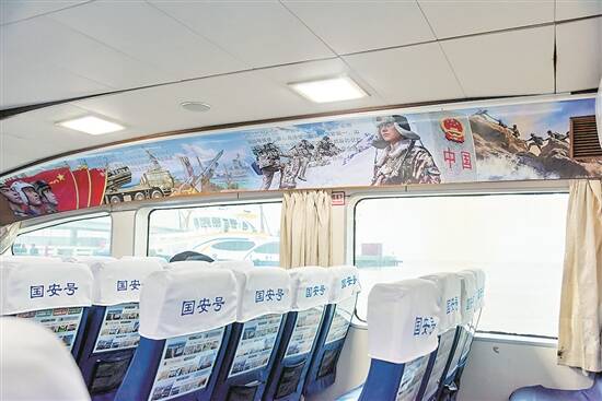 “国安号”客船舱内利用有限空间展示了多幅国家安全宣传长卷,还专设了宣传栏摆放宣传手册,多台屏幕循环播放国家安全宣传教育短片。乘客可通过多种方式接受国家安全教育的洗礼和熏陶。