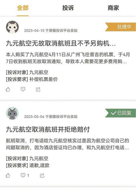 记者看到,在黑猫投诉平台上,投诉编号为1736610****的用户也表示,近日收到九元航空公司由于“公司原因”临时取消航班的通知,且同样无法改签当天其他航班,只能临时购买其他航司的机票。该用户称,希望九元航空赔偿机票差价,但周旋一个月仍未果。还有用户表示,在起飞前10小时突然被九元航空告知因公司原因取消航班,导致额外增加200多元的酒店费用。此外,还有一些用户就九元航空仅通过短信通知的形式来告知航班取消信息的行为表示不满,认为没有尽到提醒义务。