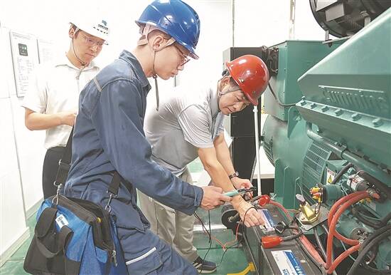 工作人员检查中山市实验高中自备发电机启动电池电压 孙蓉 摄