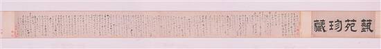 据介绍,该文物全长10.8米,宽0.3米。手迹部分长3.16米,内容为明代大儒“白沙先生”陈献章于明成化癸卯年(即成化十九年,公元1483年)五十六岁时受诏上京,被授予翰林院检讨一职后南归至桃源(今江苏泗阳)时,以毛笔所书《出潞河》等20首诗作。卷首为黎惟敬题《艺苑珍藏》,手卷前后有翁方纲、梁鼎芬、吴荣光、蔡之定等历代著名学者、书法家或收藏家的诸通题跋。其中,梁鼎芬的诗跋与白沙诗作相对应,达20首之多。该文物是目前存世的最具代表性的陈献章书法作品之一,有重要的艺术价值和历史价值。蔡之定赞誉此卷“无意求佳”,然而“笔墨俱化,纯任自然”。