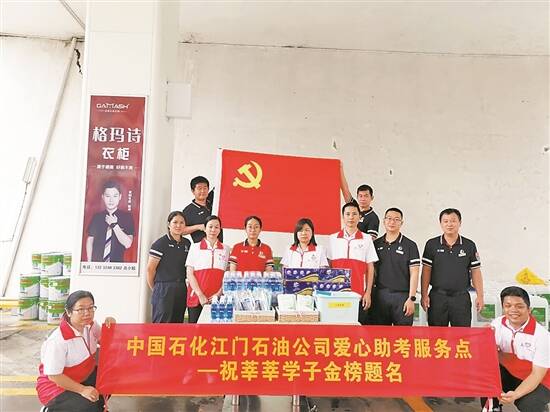 2023年高考期间,江门中石化设置爱心助考点,配备雨伞、清凉油、肠胃药、解暑药、止血贴等物资,考生可凭准考证免费领取爱心礼包(卓玛泉矿泉水+爱心文具+口罩)。同时,在全区位于考场附近的加油站开辟高考“绿色加油通道”,安排党员志愿者引导车辆不鸣喇叭、安静加油,为考生营造舒服安静的考试环境。 (文/图 彭思柳)