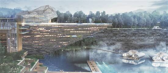 此次动工的悦椿酒店占地5万平方米,高19.5米,设置3层,有客房111间。酒店主体犹如一块天外飞来的巨石停靠在一个倒椎体上,仿佛摆脱了重力悬浮在空中。除此之外,酒店还有崖壁客房、巨石大堂、漂浮泳池和石窟汤池四个业态特色。