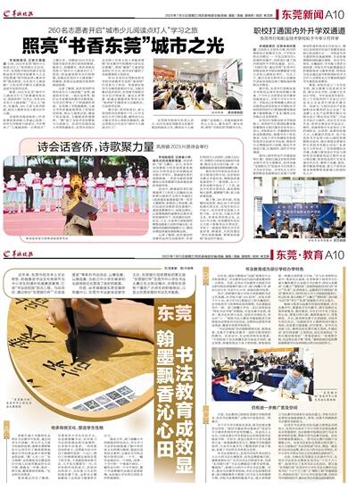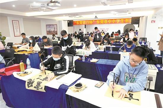 近年来,东莞市结合本土文化特色,积极推进书法文化传承作为中小学生的课外拓展素质教育,打造“书法进校园”阳光工程。与此同时,通过举办“东莞银行杯”“长安选堂奖”等系列书法活动,以赛促教、以展促教,为助力中小学生继承和弘扬传统文化营造了良好的氛围。