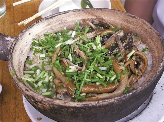吃鳝鱼丝的极致,应该是发源自广东的黄鳝饭,吃到的每一口饭都混合着香嫩的鳝肉,“啖啖肉”的快乐不过如此。将鳝鱼丝加姜蒜略炒后,放入瓦煲和刚煮开的米饭一起焖到熟,起锅前撒入葱花、倒入豉油,开盖捞匀。有的做法还会在饭中放入黄鳝血,让香味更加浓郁。