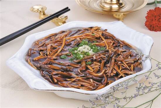 类似的做法,在宁波菜里叫“鳝丝糊剌”——炒好的鳝丝在盘里堆成一座小山,“山顶”留出一个坑形,再将沸腾的香油倒入坑内,鳝丝被浸润得油亮诱人,因此这道菜在宁波又名“鳝油”。