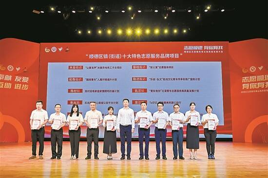 大会还颁发了顺德区镇(街道)十大特色志愿服务品牌项目,这些特色品牌都结合镇街实际,聚焦为老百姓办实事,涵盖了异地务工子女关爱、人居环境提升、非遗文化传承等多个领域。