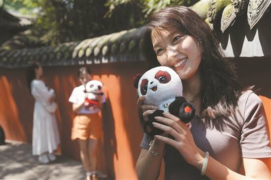 游客手捧成都大运会吉祥物“蓉宝”在杜甫草堂的红墙边留影