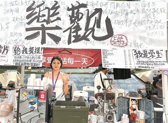 青春与咖啡碰撞,奇妙的化学反应油然而生。记者留意到,咖啡节展位的店主几乎都是青春面孔,有80、90后,更不乏00后和学生族。“樂观咖啡”在展位上贴出的“学生可八折,因为我也是学生”的手写宣传语吸引了记者的目光。作为咖啡店合伙人之一的陈晓彤今年18岁,目前正大一在读,早在读高中时作为美术生的她就参与到店铺的视觉设计中。只见店铺名“樂观”二字的背后,铺满了手写字“看海看世界、向阳而生、成为自己想成为的人……”,仿佛诠释着“乐观”二字背后的涵义。陈晓彤说,这是他们首次参加咖啡节,想走出咖啡店所在的石碣镇,让更多人了解到“樂观”咖啡店。
