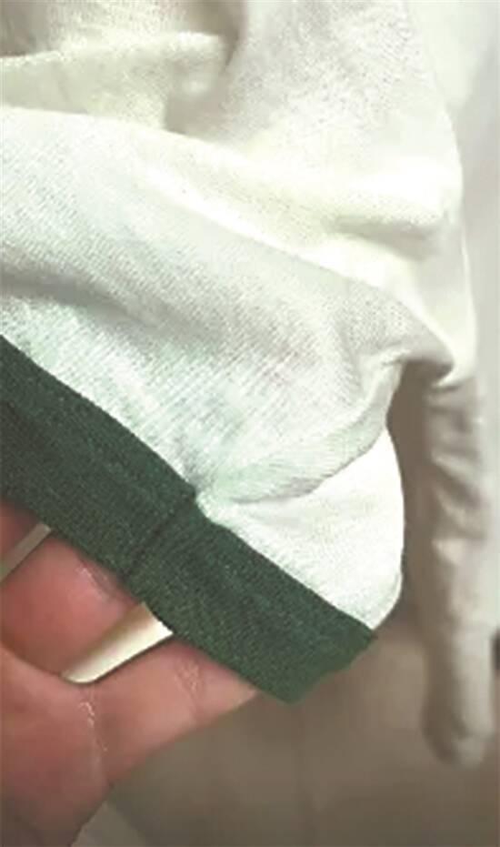 羊城晚报记者通过古驰官网进行查询,杨先生投诉的这件T恤,官方名称为“饰Gucci刺绣针织棉T恤”,单价4400元,有米白色和蓝色两个款式。在产品细节方面提到,“这款米白色单品选用针织棉匠心打造,饰有撞色滚边”。面料为100%棉,绣花为100%聚酯纤维。从用料来看,仅包含棉和聚酯纤维,并无特殊材料。“袖口这么严重的褪色,我随便到哪家店几十块钱的衣服也不可能穿两天就会掉色。”杨先生说,自己曾多次购买古驰品牌的T恤,都是一样的清洗方式,并没有出现过掉色的情况。