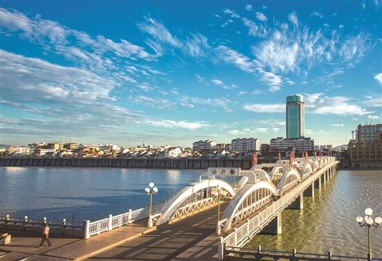 清晨的第一缕阳光洒在梅江上,河水瞬间被染得金光闪闪,河面在微风吹拂下泛起阵阵涟漪。梅江是梅州人民的“母亲河”,流经梅州城区,从梅城中心穿过,呈U形走势缓缓流淌,梅江桥便伫立于梅江U形河道顶端。
