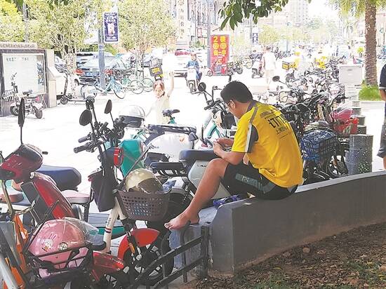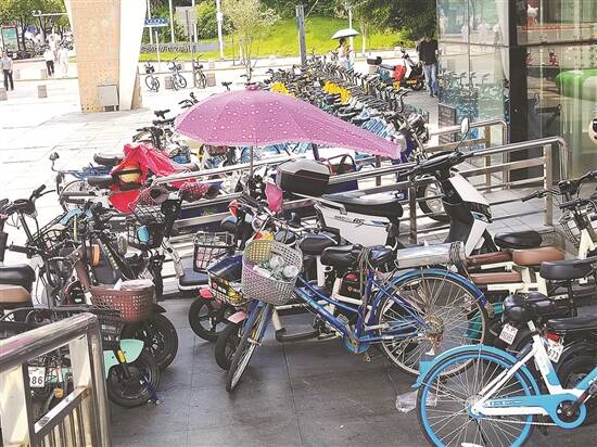 在划设了非机动车停车位的商圈,情况又是如何?在东城万达广场商圈一带,记者看到,东纵路两边虽划设了非机动车停车位,但却呈现“两重天”的景象。该商圈内,共享单车由于有统一运营方管理,摆放较为整齐。而电动自行车停放则很是随意、混乱,很少有停放在划设的停车位内的。有的杂乱无章摆放在天桥下,有的簇拥在大树下,有的则零散停靠在围栏边。对此,一位送外卖的小哥告诉记者:“电动车电池不能长时间暴晒,因此都将车停在有阴凉的地方。”