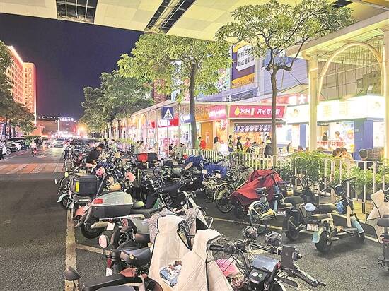 连日来,记者多次走访该商圈发现,鸿福路南侧的人行通道上自行车和电动车杂乱无章地堆放在一起,车堆最外侧已经逼近盲道,场面“壮观”。“这边人和车都太多了,我们只能‘见缝插针’。”不少骑着电动自行车前来逛商场的市民表示,由于莱蒙商业中心和东莞印象汇商场门口的广场上均不允许停放自行车和电动车,因此他们一般都选择将车停在人行通道上。这让原本宽阔的人行通道也变得越来越窄,影响行人和非机动车正常通行,也堵塞消防通道。而商圈中的亨元路美食街内的电动车停放更是拥挤不堪。亨元路美食街地处莱蒙商业中心和东莞印象汇两个商场中间,长约100米,热闹的夜市吸引了大量客流。记者现场看到,该条美食街内并未划设电动车停放区域,不少电动车直接停放在黄色网格线内或机动车停车位上。