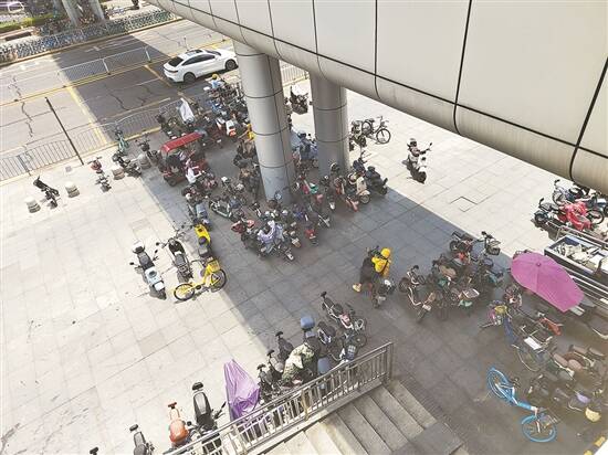 近处电动自行车杂乱停放,且挡住天桥下行出入口,远处共享单车则停放有序