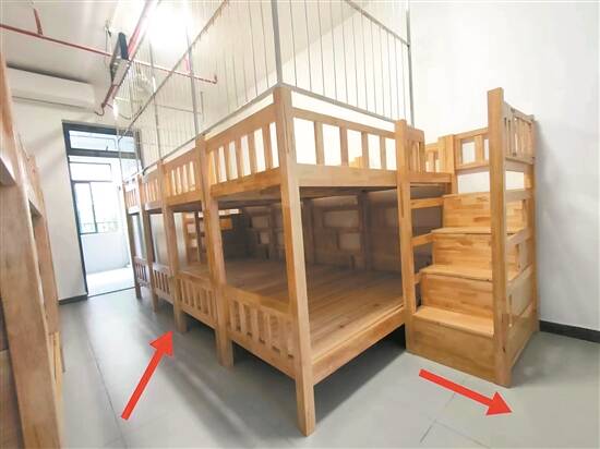家长们向校方提出意见,希望学校保证每床一人,拆除上铺的安全防护网,预留出充足的休息、逃生空间;同时,降低床铺布局密度,将拼接在一起的4张床铺分开放置,并在左、中、右分别安装楼梯方便孩子上下床。