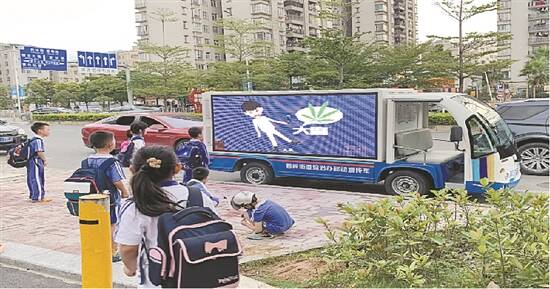 如何改变单一的宣传模式,创新禁毒工作方法?碧岭街道以深入群众为原则,发挥宣传车机动性、灵活性优势,常态化开展禁毒流动宣传,自2019年宣传车投入使用以来,累计宣传时长已超1200小时。宣传车循环播放禁毒短视频,按照既定路线穿梭在大街小巷,时而在学校、广场、花园小区、城中村等人流密集区域停留,成为一道流动的风景线,在辖区营造了良好的禁毒工作氛围。