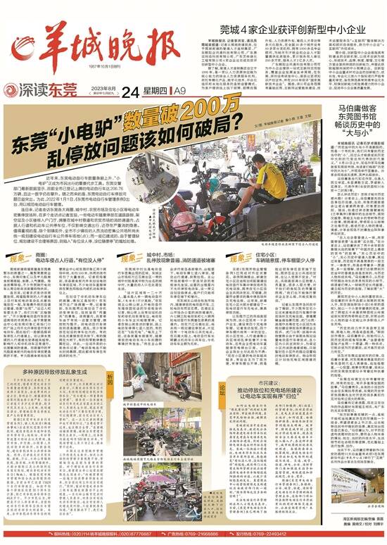 8月24日,《羊城晚报》以“东莞‘小电驴’数量破200万,乱停放问题该如何破局?”为题刊发新闻报道,全面聚焦东莞各大商圈、城中村、农贸市场以及住宅小区等场所的电动车停放乱象,通过现场走访,深入剖析东莞电动车停放乱象生成的原因,并抛砖引玉,邀请市民和相关业内人士就如何让电动车实现有序“归位”发表意见。