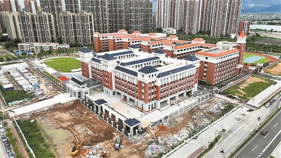 走进博雅小学,笔者看见高5层的教学楼呈回字形结构,其中雅心楼、雅智楼、雅文楼三列教学楼相互连接,过道紧密相连。教学楼主体已建设完成,灰蓝色的屋顶与红白色的墙面美观相映,室内装修部分目前也在同步收尾完善,开学时,24间教室将全部启用。