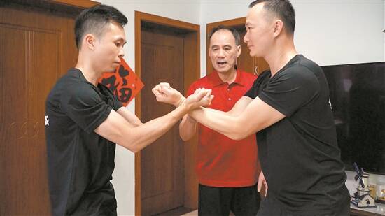 在记者到来之前,陈建明的两个徒弟已经在客厅里准备练拳。他们二人身穿印有“南螳螂拳”字样的黑色T恤,练起了基本功。只见他们气沉丹田,伸出双手,将全身的劲缓缓集中在手上,出拳时动作迅速,勇猛有力。练完一个基础套路后,他们的脸上已经微微见汗。随后又开始分组对打练习,双方你来我往、你攻我守,碰撞激烈时还能清晰听到“啪”一声的脆响。
