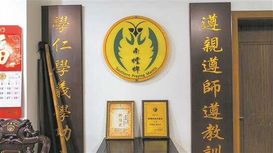 沿着具有年代感的楼梯上三楼,进门后首先映入眼帘的是墙上雕刻着“南螳螂”字样的木牌匾,两边是一幅“遵亲遵师遵教训,学仁学义学功夫”的对联。牌匾下方的墙角,堆放着练武器械。客厅摆着一个茶台,旁边是三张古式木椅,中间空出一块地方。“对联是祖训,寄托着祖师爷的谆谆教导和殷切希望,是我们要一直遵守的。客厅留出的空地就是平常徒弟们练武的地方,因为练螳螂拳不需要很大空间。”陈建明说。