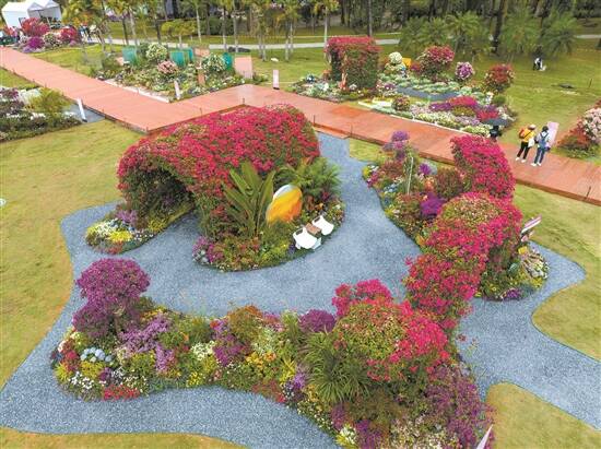企业展园位于公园南门入口的椰风林大草坪,面积约1.2万平方米,由通过方案遴选脱颖而出的10家园林企业优秀花园作品组成,各参展花园以簕杜鹃为主题,使用绿色环保、可回收重复利用的材料来展现簕杜鹃在园林中丰富多彩的应用场景。园艺超市同样位于椰风林大草坪,穿插在企业展园中,由2个展棚和20组摊位组成,展棚内邀请优质簕杜鹃花卉企业入驻,展示和售卖簕杜鹃及其他花卉等相关的园艺产品。