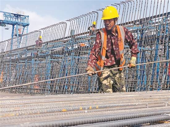 工人们搭建箱梁钢筋笼