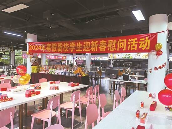 龙年春节将至,为了丰富留校学生的生活,增添校园节日氛围,广东多所高校举办了一系列迎新春活动,为同学们送上节日祝福。各高校“各出奇招”,不仅有装点一新的校园,还有各式各样的趣味活动和新春福利,更有师长温暖人心的慰问和祝福,让同学们感受到在学校、在广东过大年的浓浓年味。