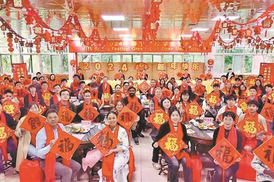 2月3日,暨南大学在不同校区举行了留校学生春节团拜活动。暨大党委书记林如鹏、校长邢锋分别向老师、同学们致以新春的祝福和节日的问候。来自五洲四海的同学们围坐在一起,共同品尝各地美食。现场,同学们还收到了新春礼包和福字,在一片红火和热烈的氛围中感受节日的温暖。据统计,暨大今年共有1700余名学生选择春节留校。